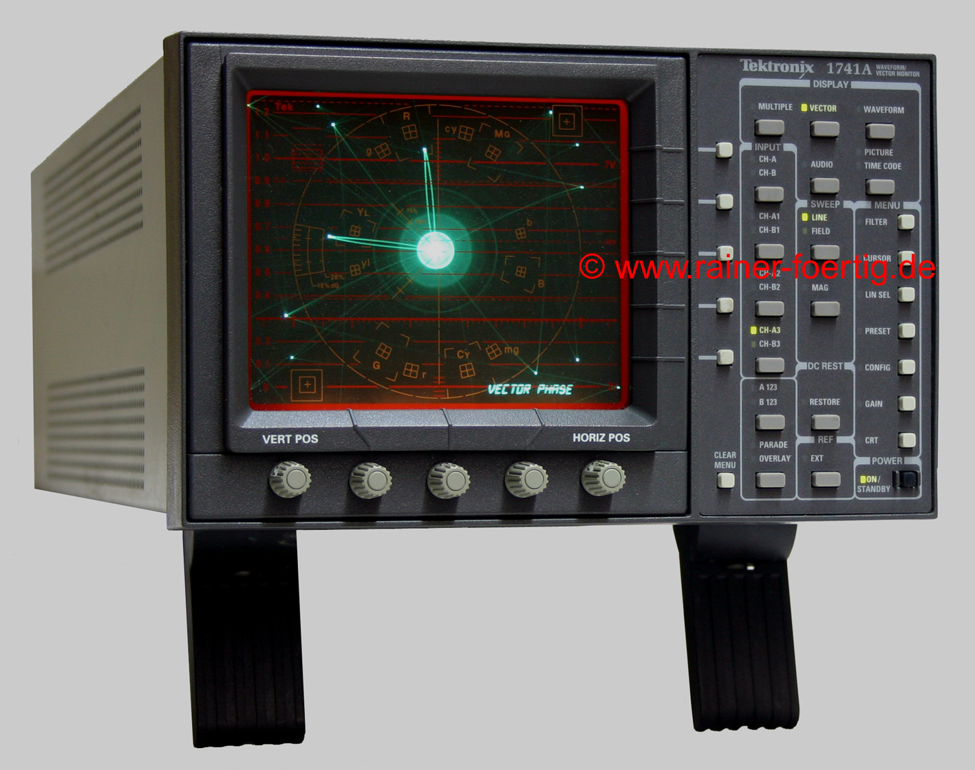 Tektronix 1741A Der PAL-Signal-Monitor 1741A ist ein vielseitiger und leistungsstarker Fernseh-Signal-Monitor, der für den Einsatz in Studios, Übertragungswagen, Aufzeichnungsanlagen und Übertragungseinrichtungen entwickelt wurde. Das Gerät verfügt über 8 Eingangskanäle. Er kann als Vectorsope und als Waveform-Monitor verwendet werden, beides kann übereinander dargestellt werden oder auch einzeln. Des Weiteren kann auch das Videosignal als monochromes Fernsehbild betrachtet werden. Das obere Bild zeigt das Vectorbild des unten dargestellten Testbildes. Hier können Sie die ausführlichen technischen Daten ansehen: Tek 1740A - 1750A Serie Abmessungen: ca. 216 x 460 x 135 mm, Gewicht etwa 4 kg. Gebraucht, in gutem Zustand und in den Grundfunktionen überprüft kostet ein Stück 1.399,-- € inkl. MwSt. Die technischen Daten gibt es hier: Tektronix 1740A - 1750A Serie |