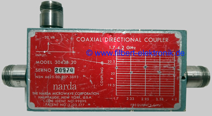 3043B-20 Dieser direktionaler Richtkoppler von Narda ist für den Frequenzbereich von 1,7 GHz...4,2 GHz mit einer Auskoppeldämpfung von -20 dB, die Impedanz beträgt 50 Ohm, Anschlußnorm N. Gebraucht, in gutem Zustand kostet ein 3043B-20 35,70 € inkl. MwSt. Technische Daten im "PDF" Format: Narda 3041-3042-3043-3044-3045 TD |